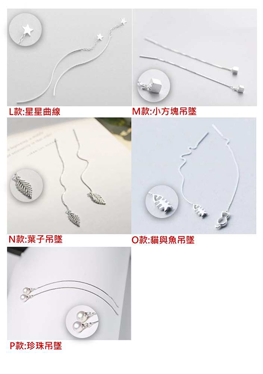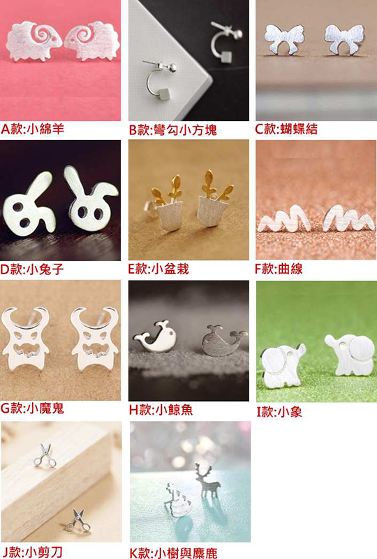 款式:A款:小綿羊/B款:彎勾小方塊/C款:蝴蝶結/D款:小兔子/E款:小盆栽/F款:曲線/G款:小魔鬼/H款:小鯨魚/I款:小象/J款:小剪刀/K款:小樹與麋鹿/L款:星星曲線/M款:小方塊吊墜/N款:葉子吊墜/O款:貓與魚吊墜/P款:珍珠吊墜