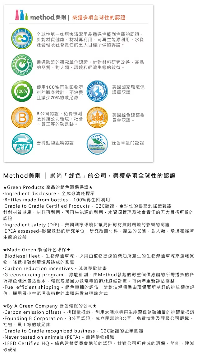 我們的綠色團隊針對每一個我們要使用的成份加以嚴格的檢驗,好確保我們使用的每個成份的安全性。 這也是為什麼美則所有的產品對人或家中寵物都那麼友善,獨特的配方只對髒污出招卻不會傷害妳一根毛髮或是你的寶貝寵物一根腳趾頭!